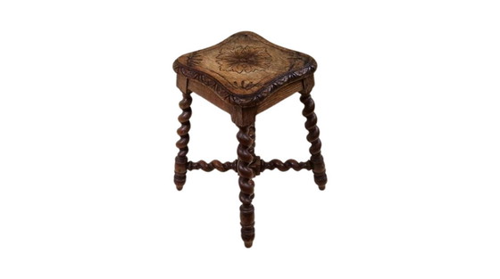Ce tabouret repose sur des pieds torsadés évasés, reliés par une entretoise transversale fuselée, et ornés d'un fleuron décoratif inversé en son centre. Son design lui confère un charme indéniable et un caractère victorien classique.