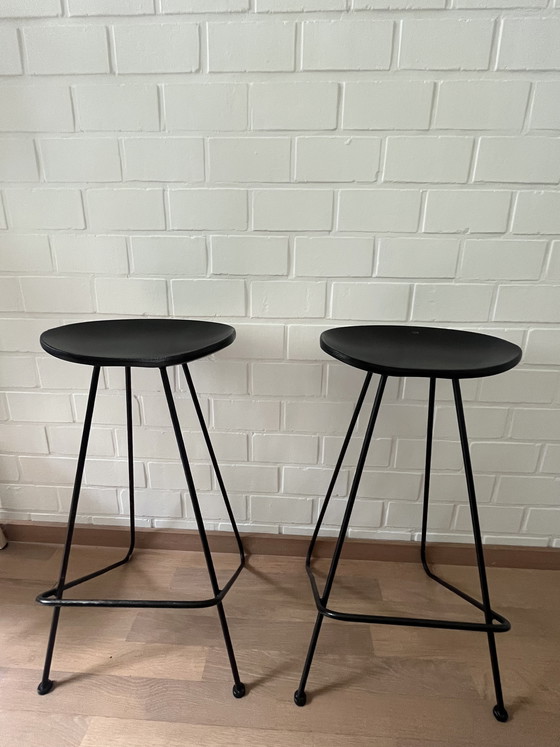 Tabouret de bar au design classique, assise en bois et structure en fer. Présente des traces d'utilisation.