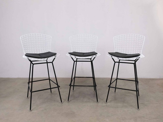 Cet ensemble de trois tabourets de bar, signé Harry Bertoia et conçu vers 1950, est un classique emblématique du design Mid-Century Modern. Les assises en maille métallique laquée blanche séduisent par leur légèreté sculpturale et contrastent harmonieusement avec les structures en métal laqué noir. Leurs lignes épurées et leur structure aérienne confèrent à ces tabourets un style intemporel et polyvalent. L'ensemble est en très bon état, présentant seulement de légères traces d'usure liées à son âge. Idéal pour les îlots de cuisine, les comptoirs de bar ou les espaces commerciaux élégants, il constitue un ensemble design de grande qualité, à la forte présence visuelle.