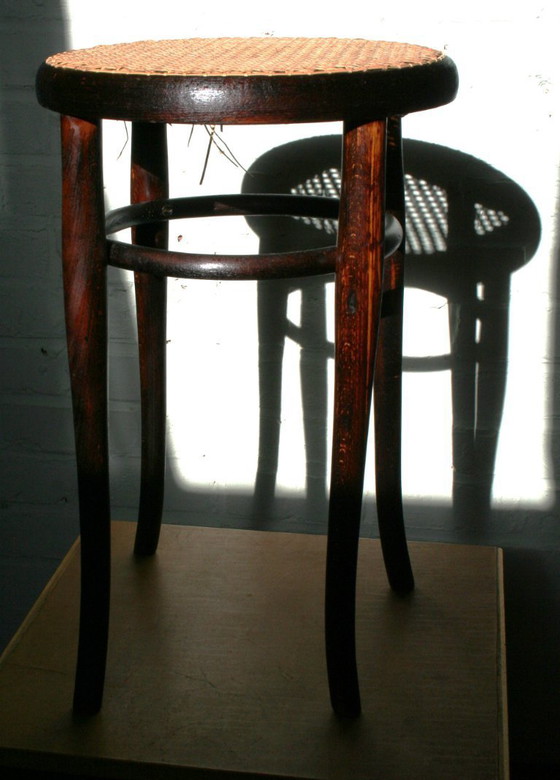 La structure de ce tabouret Thonet signé a été découverte lors du débarras d'une cave. Ayant survécu à un incendie, sa magnifique patine a été préservée lors de la restauration. Le bois présente une patine distinctive et des nuances de couleurs qui varient considérablement selon la lumière. Il a été restauré avec soin, selon des méthodes traditionnelles et avec des matériaux authentiques. Très robuste et stable, il a été rempoté à nouveau de façon traditionnelle. Datation : certainement antérieure à 1922. Un objet magnifique, solide et intemporel.