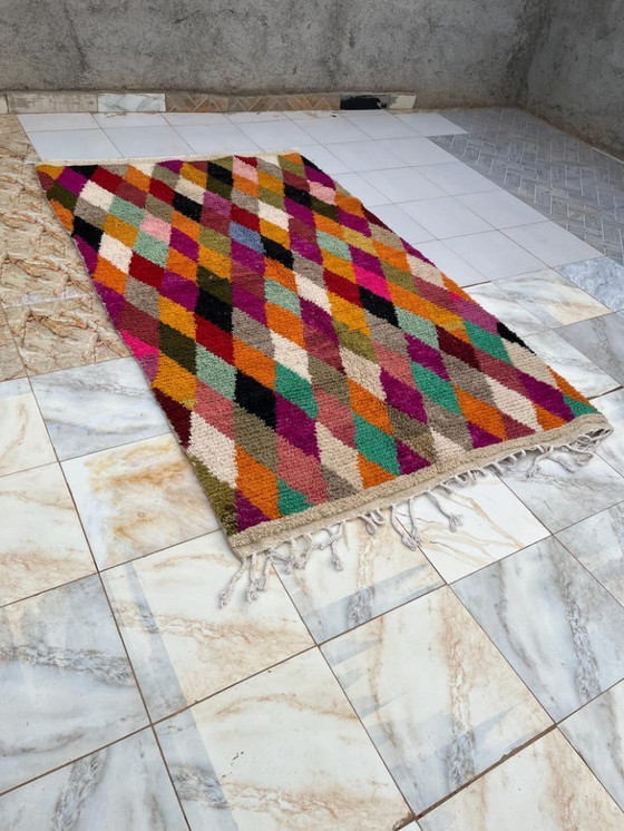 Plongez dans le charme vibrant de ce tapis berbère multicolore, confectionné avec soin à partir de laine de haute qualité. Mesurant 200 cm x 150 cm, cette pièce exquise témoigne d'un savoir-faire traditionnel et d'une expression artistique, et apportera une touche bohème à votre intérieur.