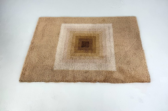 Ce superbe tapis en laine présente des motifs géométriques. Le style de Verner Panton est clairement visible dans l'agencement des carrés concentriques, créant un dégradé de brun à beige clair.