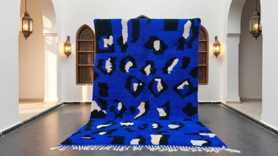 Sublimez votre intérieur avec ce magnifique tapis en laine tissé à la main, alliant art et confort. Sa palette vibrante de bleu, noir et beige crée un impact visuel saisissant, en faisant la pièce maîtresse de n'importe quelle pièce. Confectionné avec un souci du détail méticuleux, ce tapis incarne l'élégance moderne et un design intemporel.