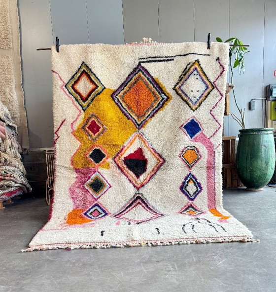 Ce tapis marocain présente une palette de couleurs captivante et un motif géométrique unique et complexe. Composé d'un ensemble de carrés et de rectangles interconnectés, il crée une composition visuellement attrayante qui confère profondeur et dimension à la pièce. Sa texture moelleuse et accueillante, ainsi que son épaisseur, promettent un confort optimal sous les pieds.