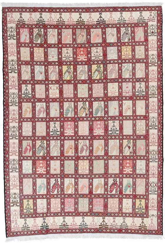 NOUVEAU tapis persan authentique Verni Kelim avec velours de soie sur un fond de coton avec un beau motif de carreaux tribaux. Ces tapis tribaux faits main sont parfois appelés Ardabil, Nimbaft ou Sirjan et sont fabriqués dans des villages du nord-ouest de l'Iran. Ces tapis vernis en soie sur coton sont parfaits pour être posés sur le sol, accrochés au mur ou utilisés comme décoration intérieure et font partie des types de tapis kilim persans les plus polyvalents.