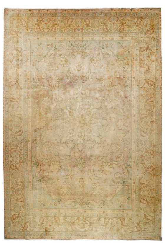 Nos tapis vintage, trouvés en Iran, sont issus de tapis persans usagés qui poursuivent leur voyage après avoir été remodelés et redessinés. Des designers iraniens recyclent de vieux tapis persans artisanaux comme matière première pour leurs créations. Chaque tapis est soigneusement sélectionné et subit un processus unique de lavage et de neutralisation des couleurs. Lors de ce processus créatif, des parties du poil sont retirées ou réduites pour créer un nouveau motif. Le tapis est ensuite reteint dans de nouvelles couleurs et motifs captivants. Le résultat est une œuvre d'art unique, moderne et individuelle. Naturellement, ces tapis sont vintage, anciens et usagés, et leur état varie en conséquence, ce qui fait partie intégrante du produit.