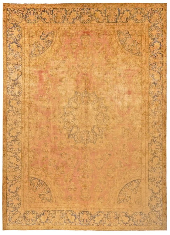 Nos tapis vintage, trouvés en Iran, sont issus de tapis persans usagés qui poursuivent leur voyage après avoir été redessinés et redessinés. Des designers iraniens recyclent de vieux tapis persans faits main comme matière première pour leurs créations. Chaque tapis est soigneusement sélectionné et subit un processus unique de lavage et de neutralisation des couleurs. Lors d'un processus créatif, des parties du velours sont retirées ou réduites pour créer un nouveau motif. Le tapis est ensuite reteint avec de nouvelles couleurs et de nouveaux motifs captivants. Il en résulte une œuvre d'art unique, moderne et individuelle. Naturellement, ces tapis sont vintage, anciens et usagés, et leur état varie en conséquence, ce qui fait partie intégrante du produit.