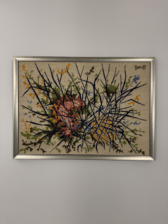Belle grande broderie originale des années 60/70 signée Elie Grekoff, artiste français du XXe siècle, connu pour ses œuvres textiles modernistes mêlant abstraction et inspiration végétale.