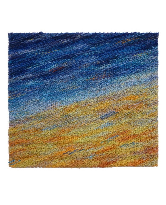 Cette tapisserie murale présente une abstraction subtile, évoquant un paysage : des bleus et des gris profonds se fondent progressivement dans des tons chauds d'or, d'ocre et de terre. Le tissage en plusieurs couches crée une profondeur picturale et une apparence sereine et raffinée qui s'intègre harmonieusement aux intérieurs modernes comme classiques.