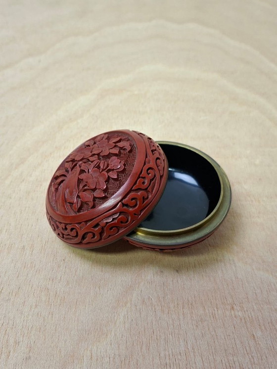 Tasse à encre rouge de Chine, fabriquée vers 1940 à Pékin. Le plateau est décoré à la main de motifs floraux et présente un intérieur laqué noir avec des accents en laiton le long du bord.