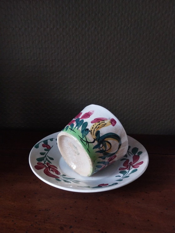 Superbe tasse à café et sa sous-tasse anciennes en faïence terre de fer de Creil et Montereau.