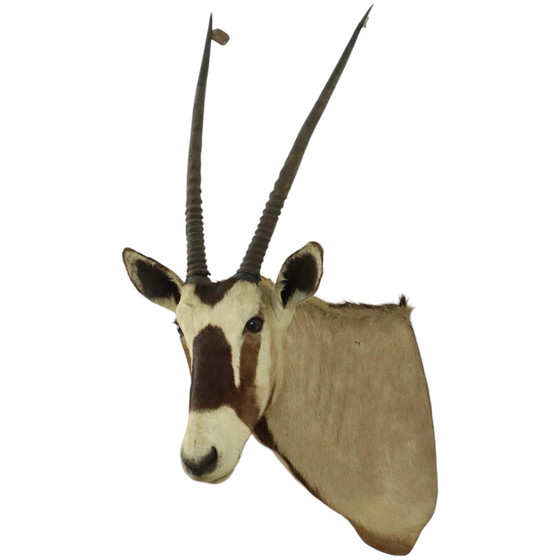 Magnifique et très impressionnant buste d'antilope Oryx empaillé avec des yeux en verre et des cornes détachables, mieux connu sous le nom de Gemsbok ou Spiesbok, antilope emblématique que l'on trouve principalement en Afrique du Sud. Elles sont très reconnaissables à leurs cornes droites et à leur combinaison unique de couleurs sur la tête. Ce magnifique buste empaillé date de la seconde moitié du XXe siècle.