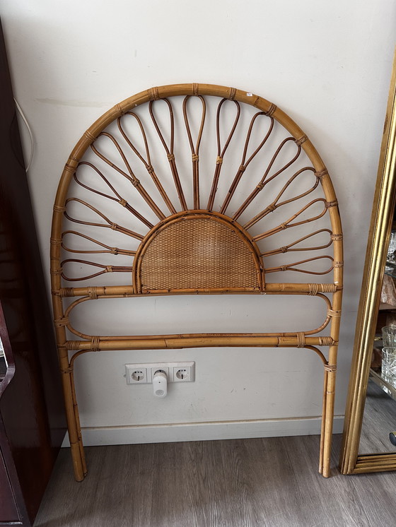 Tête de lit en rotin vintage super cool avec ce look "sunburst" reconnaissable des années 70. Fabriquée en rotin courbé avec une pièce centrale tressée et des lignes ouvertes gracieuses. Un modèle léger et aéré qui donne à votre chambre une touche vintage instantanée. En bon état, avec de légers signes d'utilisation ici et là - juste comme vous l'aimez sur une belle pièce ancienne.