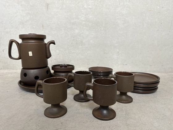 Service à café en céramique des années 70, signé Theo Potmeer pour Cor Unum Ceramics (Pays-Bas). En excellent état. Le service comprend 4 tasses à café avec leurs soucoupes (14 cm), 4 assiettes à gâteaux (17 cm), une cafetière avec couvercle, un chauffe-plat, un sucrier avec couvercle et un plat de service (27,5 cm). Poids : 6,5 kg.