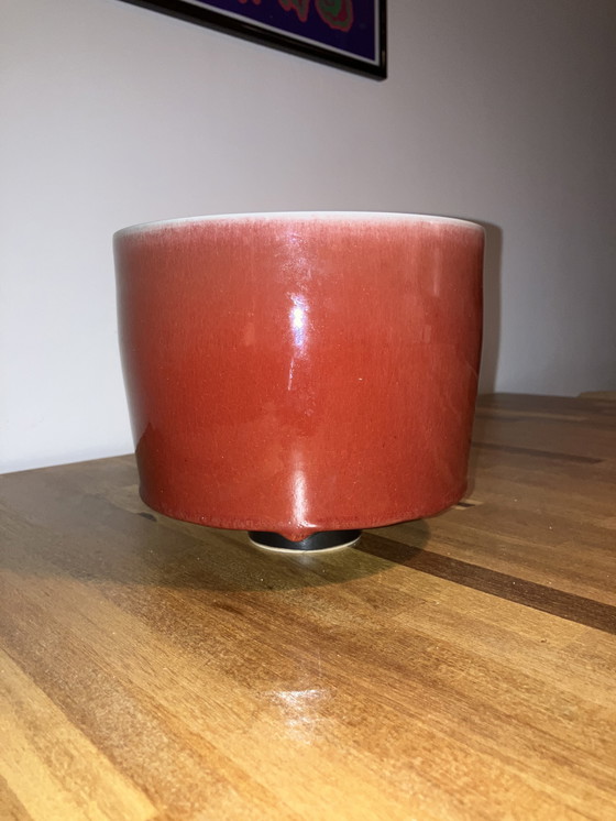 Grès, émail rouge sang-de-boeuf coulant à la base, émail noir mat à l'intérieur et au pied, le récipient à double paroi avec puits profond et surélevé sur un petit pied, sceau TB imprimé.