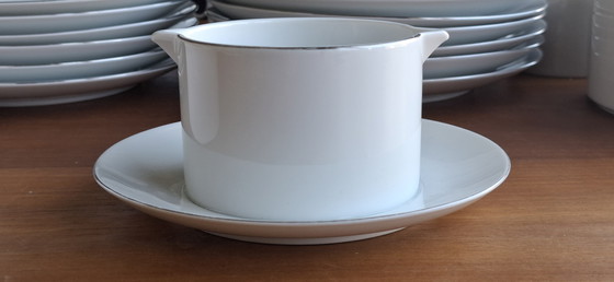 Il s'agit d'une saucière Thomas Germany Serie Medaillon avec un bord argenté. Elle présente un design classique, parfait pour les salles à manger élégantes. Le matériau en porcelaine garantit la durabilité et une apparence raffinée. Idéale pour servir des sauces ou des jus de viande, elle complète toute collection de vaisselle.