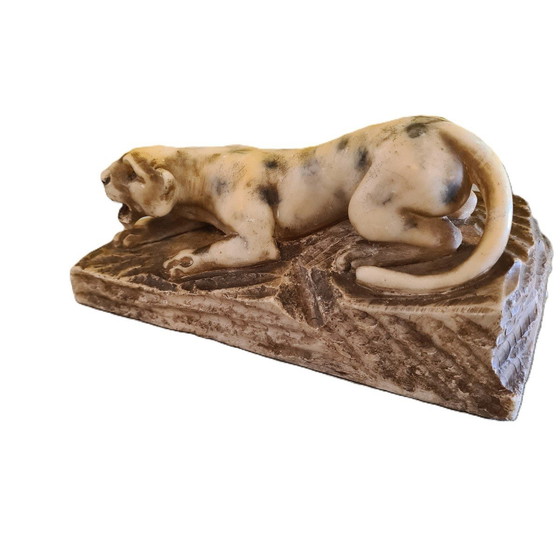 Sculpture française en albâtre de style art déco représentant un tigre rôdant. Elle est sculptée à la main à partir d'un seul morceau d'albâtre et n'est pas signée. En bon état pour son âge. Dimensions : 18,5 cm de long, 7,5 cm de large et 9 cm de haut. N° 5867.1