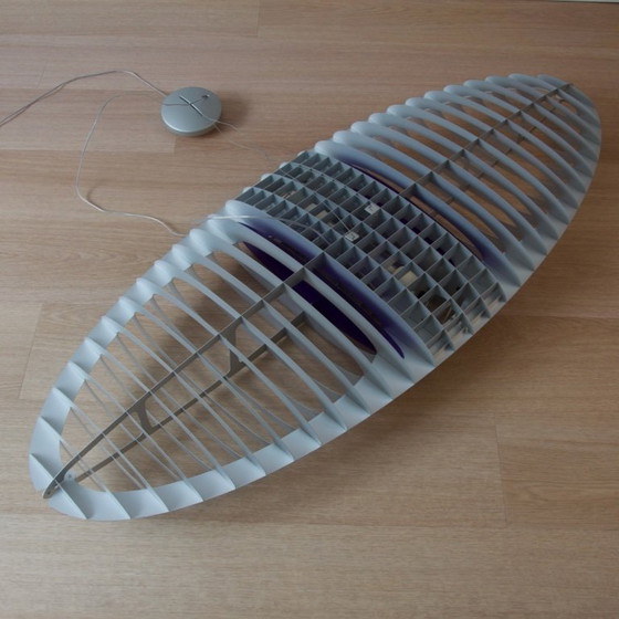 Titania Queen, une suspension emblématique de Luceplan. Conçue par Paolo Rizzatto et Alberto Meda en 1989, c'est un objet intemporel, moderne et polyvalent. Mince comme une plume, un volume flottant, léger dans sa forme et innovant dans son contenu. C'est magique, il fournit une lumière blanche claire, tandis que le luminaire lui-même est éclairé en violet (ou en rouge ou en vert si vous changez les filtres). Coque lamellaire de couleur titane/aluminium. Les nouveaux jeux de filtres coûtent 80 € par couleur et les nôtres sont livrés avec le violet installé plus 2 filtres (neufs dans la boîte) rouge et vert. Il n'est pas livré avec le kit optionnel de montée et de descente (boule métallique pour régler la hauteur, qui peut être commandée ailleurs) ; sa hauteur est réglée dans le rozet du plafond et il est livré avec un câble métallique d'un peu plus d'un mètre de long. L'une des lamelles semble être légèrement pliée, voir les deux photos étiquetées 'B'. En très bon état, un peu de poussière, voir les photos ! Livré avec les ampoules (usagées) visibles sur les photos. (2x E27) Un vaisseau spatial futuriste flottant de forme elliptique/ovale. Titania est la plus grande lune satellite d'Uranus, qui a été nommée d'après la reine des fées dans la pièce de Shakespeare, Le Songe d'une nuit d'été.