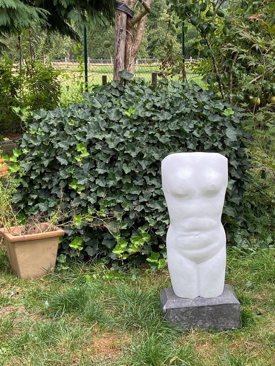 Corps féminin en marbre massif italien de première qualité. La sculpture est signée V. Batta. Cet artiste a créé plusieurs œuvres remarquables au cours des 20 dernières années. Cette pièce unique pèse 70 kilos et est à retirer à Maastricht. Le socle est en pierre bleue de Namur.