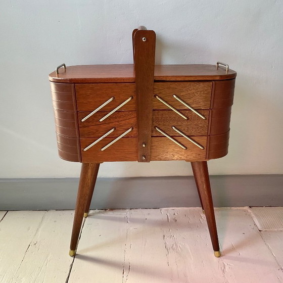 Découvrez cette charmante travailleuse vintage, une pièce idéale pour les amateurs de mobilier rétro. Fabriquée en bois avec des accents métalliques dorés, elle incarne l'élégance et la fonctionnalité d'une époque révolue.