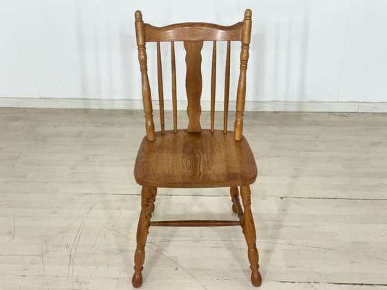 À vendre : charmante chaise en bois de style Windsor/campagne intemporel. Cette chaise séduit par sa construction robuste en bois aux tons chauds et son design classique, avec ses pieds tournés et son dossier à fuseaux caractéristique orné d'un panneau décoratif central. En bon état et solide, elle apporte une ambiance chaleureuse et rustique à n'importe quelle pièce. Seule dans l'entrée ou intégrée à un ensemble de salle à manger, cette chaise est un véritable classique qui s'accorde avec de nombreux styles.