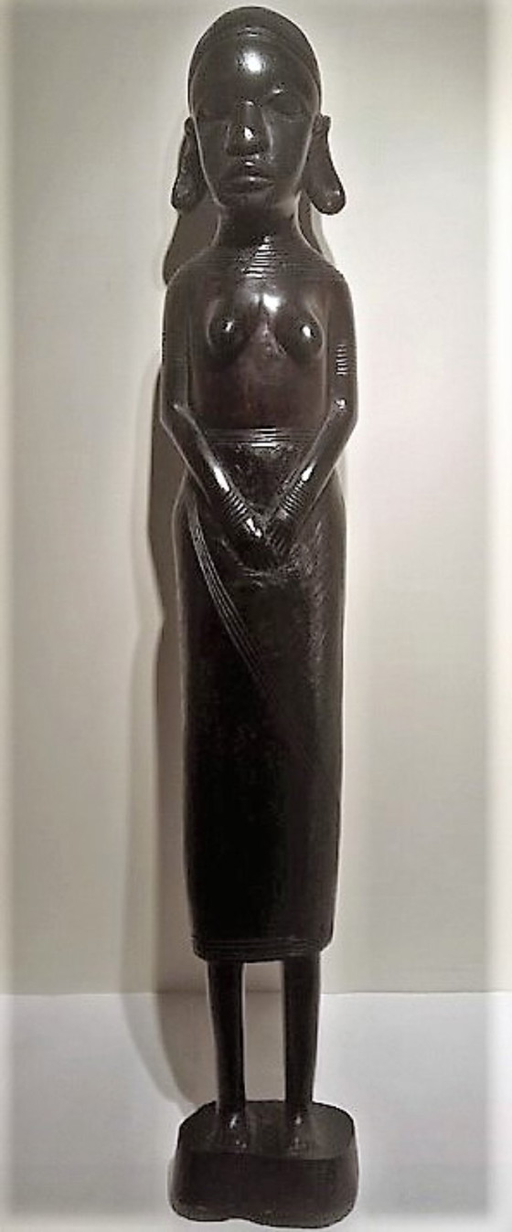 Très grande sculpture en ébène pesant près de 9 kilogrammes et mesurant 92 centimètres de haut. Selon les informations obtenues auprès de l'acheteur original, elle a été apportée du Congo (RDC) vers 1975. L'objet est en très bon état et ne présente aucun dommage ni pièce manquante.