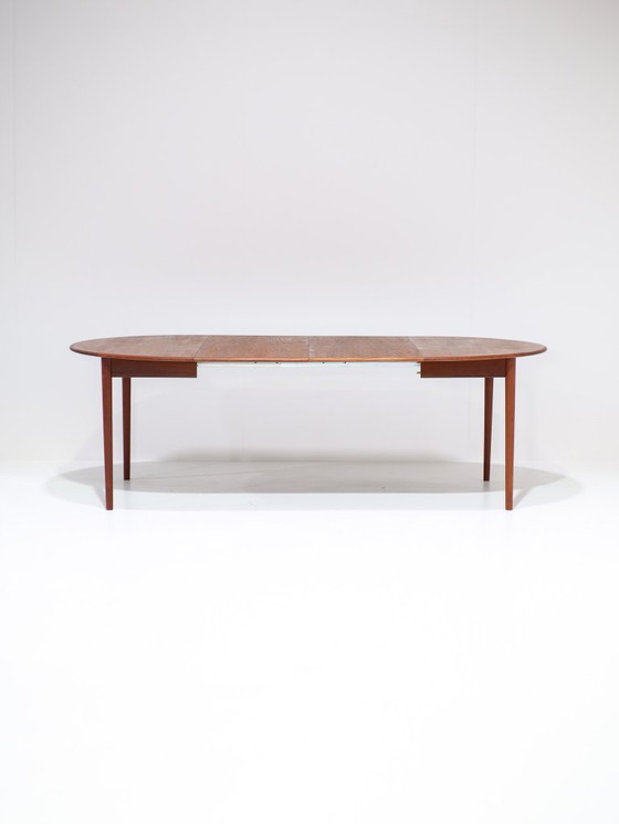 Uitschuifbare ronde / ovale eettafel uit Denemarken, jaren '60. Deze tafel is gemaakt van teakhout en heeft een minimalitstisch design met mooie randen en ronde poten. Rond is deze mid-century tafel geschikt als 4-persoons eettafel. Doordat de tafel met één tot twee extra bladen te verlengen is, tover je de tafel eenvoudig om tot een 6- of 8- persoons ovale eettafel.