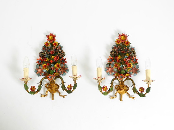 Deux superbes appliques murales des années 1960, en métal doré et peintes à la main.