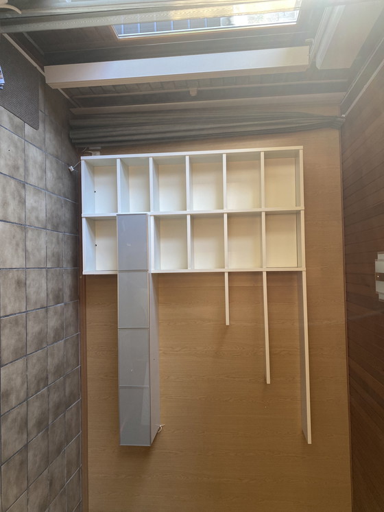 Meuble mural Banz avec 4 tiroirs et 11 étagères, idéal pour ranger des livres, par exemple. Présente de légères traces d'usure.