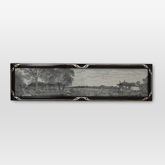 La palette monochrome met en valeur les détails complexes des bâtiments, des arbres et du paysage. La présentation équilibrée de la scène évoque un sentiment de nostalgie et de tranquillité. Le cadre antique audacieux crée un contraste frappant avec la peinture détaillée sur le délicat fond de soie qui attire le regard. Cette œuvre d'art élégante attire subtilement le regard et suscite la conversation, invitant les spectateurs à réfléchir. Apportez l'essence de la campagne exotique dans votre décor et laissez cette image captivante inspirer votre vie quotidienne.