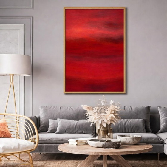 Cette magnifique œuvre de l'artiste Françoise Stoop, peinte à l'huile sur toile de jute et encadrée d'orme, dégage une atmosphère chaleureuse et accueillante. Ses riches tons rouges et ses subtiles transitions de couleurs en font une pièce remarquable qui transformera n'importe quel espace.