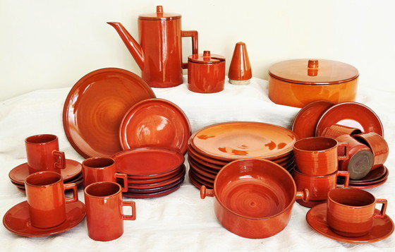 Ce service de table unique de 43 pièces de Hofra, conçu par le céramiste Hans Wagner dans les années 1970, est un bel exemple de design épuré et intemporel. La vaisselle est fabriquée à la main et sa couleur orange foncé lui confère une touche chaleureuse. Les anses carrées des tasses ajoutent une touche de modernité. Cette vaisselle n'est pas seulement fonctionnelle, elle est aussi un régal pour les yeux, parfaite pour être exposée dans un placard. Il s'agit d'une pièce précieuse pour tout collectionneur ou amateur de design vintage.