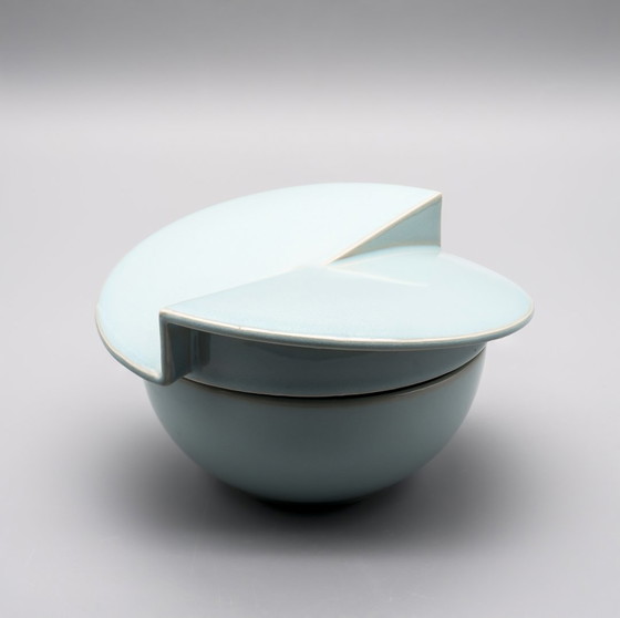 Le couvercle très angulaire, qui évoque un cercle coupé ou une pale de ventilateur abstraite, transforme le récipient en une sculpture quasi minimaliste. Exécutée dans une glaçure lumineuse **turquoise céladon**, la pièce révèle la maîtrise de la forme par van der Vaart : rationnelle, modulaire et précise, mais poétiquement équilibrée.