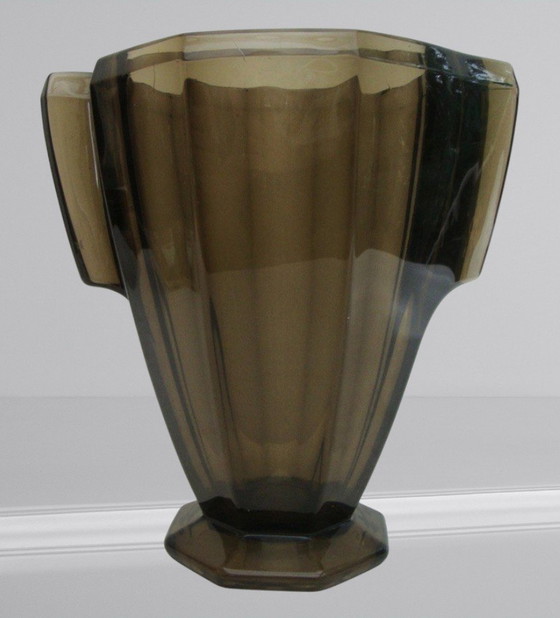 Vase en verre fumé taillé en coupe à facettes, d’un poids de 3kg, produit dans les années 30 par la verrerie Stölzle Hermanova. Son origine « Czecho Slovakia » est gravée sous le pied. Un objet d’art pur style art déco, en parfait état. Dimensions : H24,4 – D15 - envergure 24