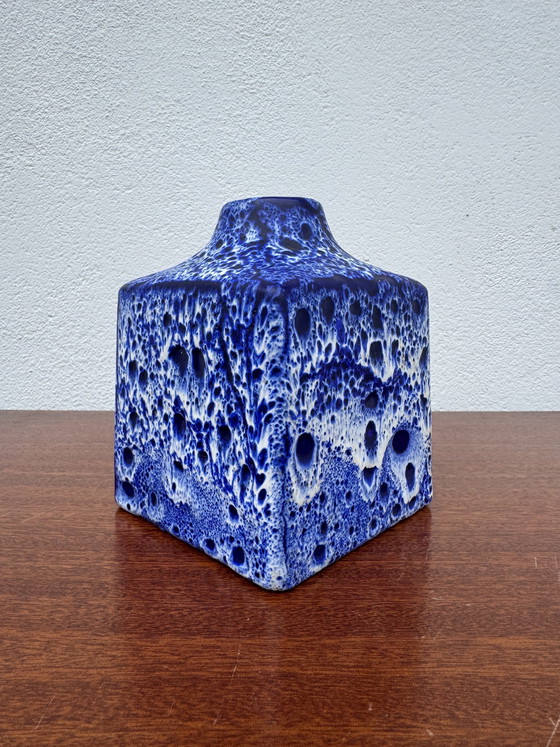 Ravissant petit vase en céramique à glaçure en relief dans les tons de bleu et blanc de forme carrée à col étroit par la manufacture allemande ES Keramik (étiquette encore présente) des années 60/70; très bon état général (très légères imperfections de fabrication)