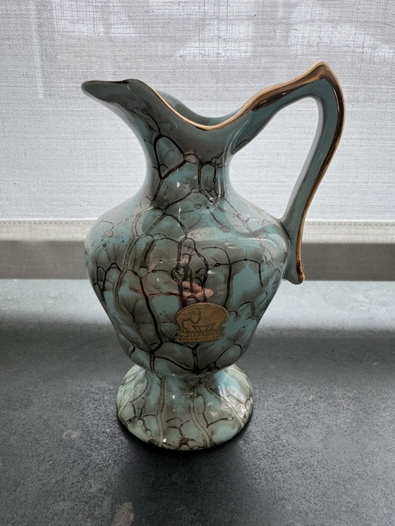 Vase/pichet Jumbo Gouda Holland vintage – modèle 107 – années 1950/60 – émail turquoise effet lave avec accents dorés – marqué.