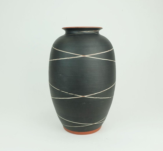Vase en céramique des années 1950, fabriqué par WEKARA (Wilhelm Krumeich KG, Ransbach-Baumbach, Allemagne). Modèle 10/30, orné d'un fin décor à fines rayures claires sur un émail noir mat. Émail roux à la base, sur le bord et à l'intérieur. Marqué sous le vase : WEKARA Handarbeit ges. gesch. 10/30.