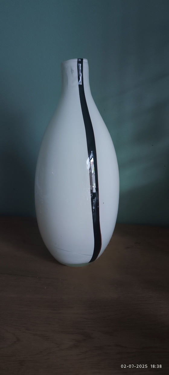 Ce vase en verre soufflé à la main des années 1970 est un magnifique exemple de design vintage. Son élégant blanc est rehaussé avec style par une rayure brune saisissante, ce qui en fait une pièce maîtresse dans tout intérieur.