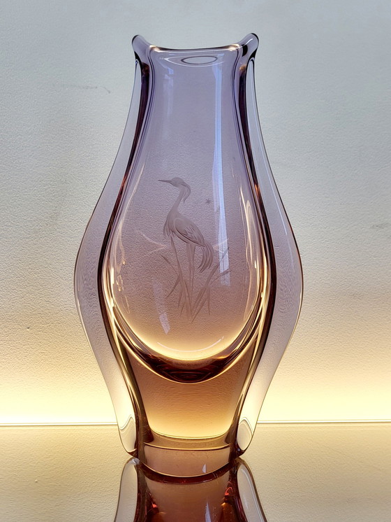 Magnifique vase en verre de couleur rose et au design organique avec une grue gravée et signée sur le devant.