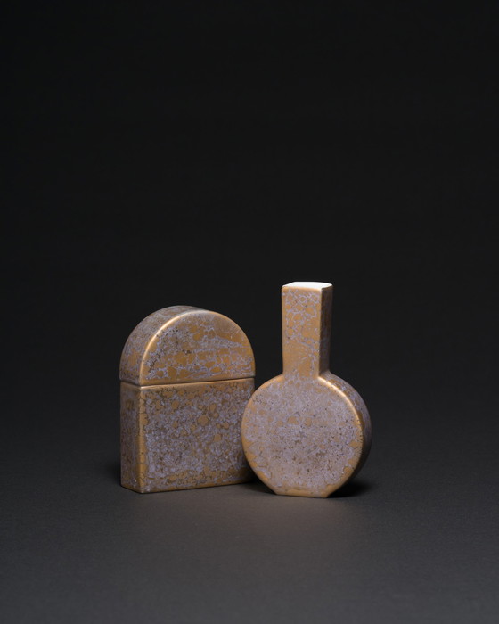 Cet ensemble réunit un vase élancé aux lignes architecturales (modèle 3775/16, 1986) et une boîte à couvercle géométrique (modèle 3774/1), tous deux réalisés dans la finition « Goldfeuer » caractéristique de Rosenthal : une surface en porcelaine satinée ornée de motifs cristallins et minéraux évoquant le métal oxydé, la pierre volcanique ou le givre doré.
