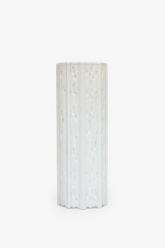 Le vase est en porcelaine biscuit. La porcelaine biscuit, non émaillée, lui confère un caractère unique. Plus fragile que la porcelaine émaillée, elle est avant tout un objet décoratif.