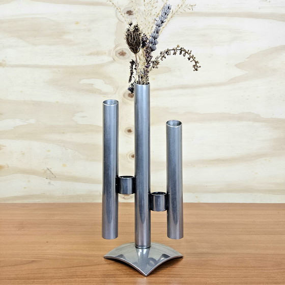 Pièce remarquable alliant forme et fonction, ce vase se compose de trois tubes cylindriques en acier assemblés sur une base carrée et incurvée. Son style minimaliste reflète parfaitement l'ère spatiale.