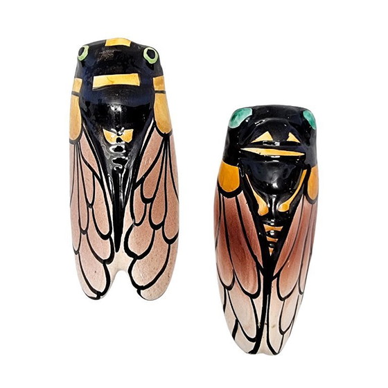 Ensemble de 2 vases muraux en céramique française représentant des cigales, datant de la seconde moitié du XXe siècle et réalisés dans le style majolique polychrome. En Provence, la cigale est également considérée comme un symbole de bonheur et d'été.