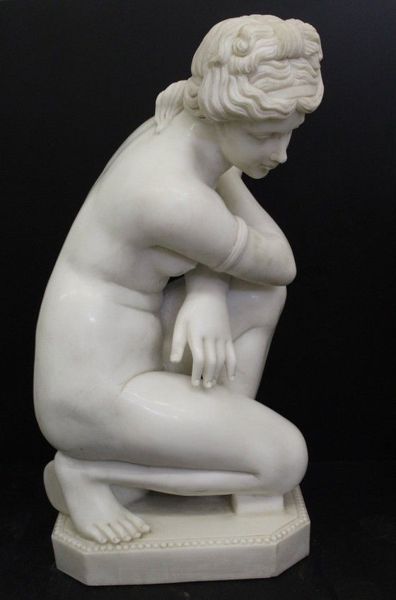 Statue de la Vénus accroupie en marbre blanc de Carrare, sculptée à presque taille réelle. Cette copie de l'original hellénistique emblématique est inspirée d'une œuvre attribuée au sculpteur Doidalsas (200-100 av. J.-C.). Des copies de la Vénus accroupie sont exposées, entre autres, au British Museum (salle 23, pièce maîtresse) et au Rijksmuseum d'Amsterdam (objet n° BK-1991-33).