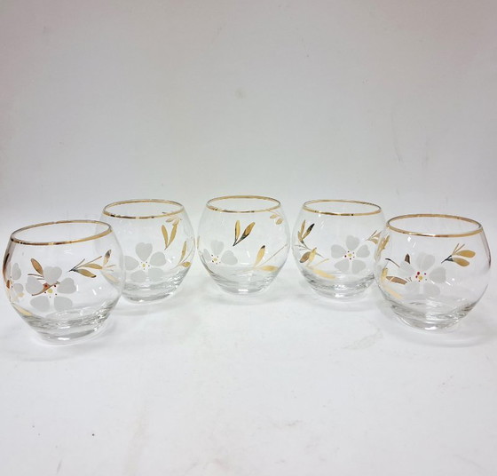 Remontez le temps avec cet exquis ensemble de cinq verres vintage « Lucky Clover » Roly Poly, typiques du milieu du XXe siècle. Chaque verre témoigne de l'élégance de cette époque, arborant un charmant motif floral qui danse sur sa surface, rehaussé de délicates touches dorées. Ces verres sont parfaits pour ajouter une note de sophistication rétro à vos réceptions ou simplement pour savourer un verre avec style en toute tranquillité.