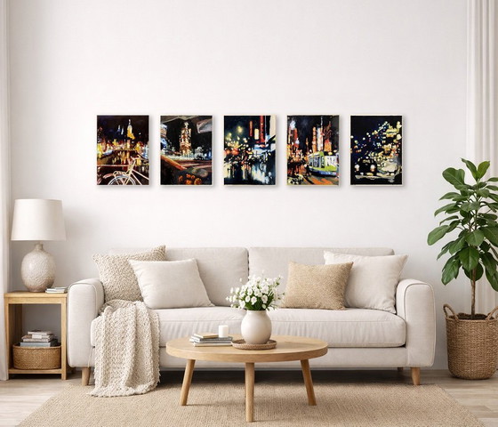 Villes nocturnes, série de peintures à l'huile 30 x 40 cm