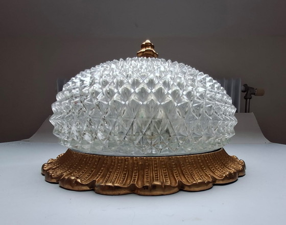 Ajoutez une touche d'élégance intemporelle à votre intérieur avec ce superbe plafonnier Limburg des années 1950, 1960 et 1970. Doté d'un dôme en verre de cristal magnifiquement taillé et d'une base ornée en laiton doré, ce plafonnier d'inspiration Art déco respire la sophistication et le charme.