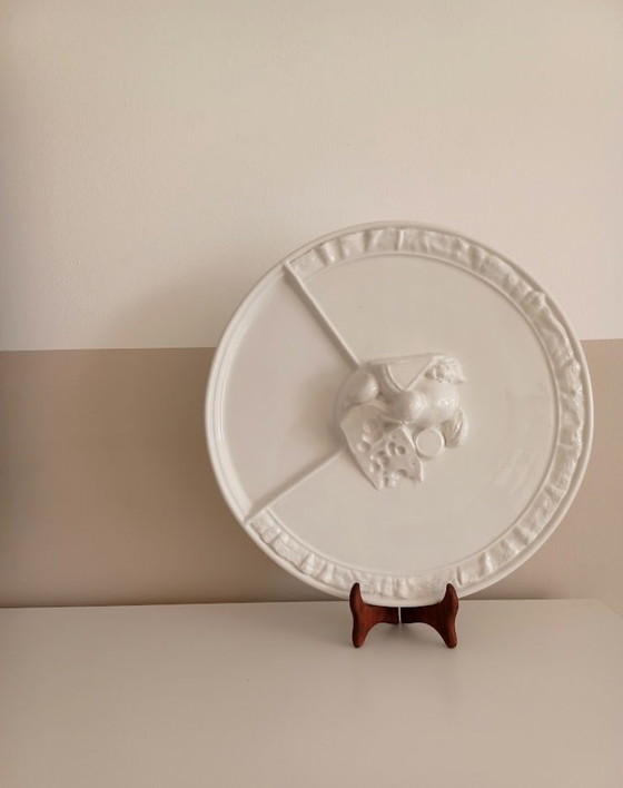 Le centre du plateau est orné d'un relief très astucieux représentant des fromages, des noix et des fruits. La céramique émaillée lui confère un aspect authentique.