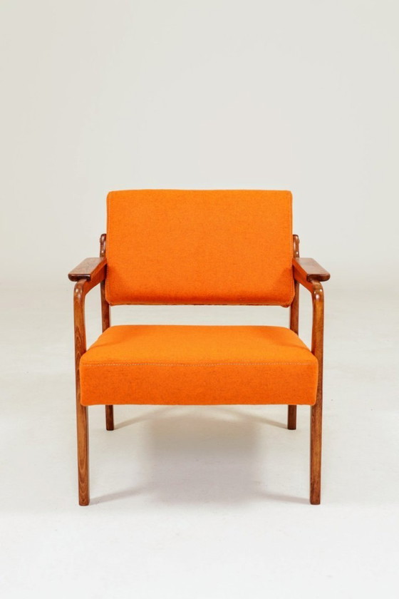 Une véritable rareté. Le fauteuil a fait l'objet d'une rénovation complète de ses éléments en bois et de son revêtement, avec un nouveau tissu 100 % laine vierge d'un orange éclatant.