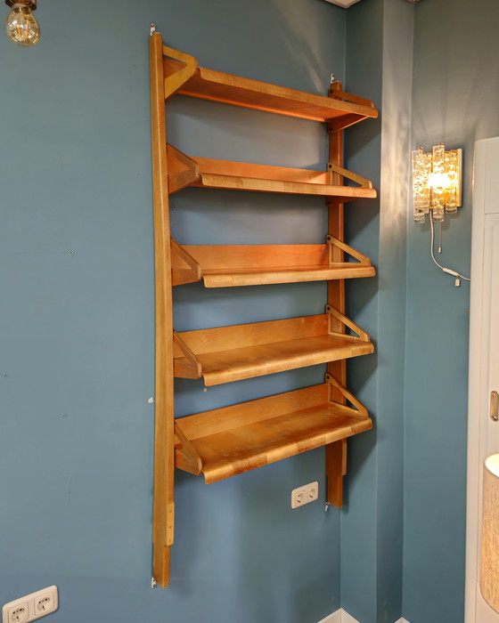 Rare meuble mural ou armoire ouverte avec cinq étagères aux bords incurvés. Il est fabriqué en contreplaqué et en bouleau. Ce meuble des années 1950 de la série Combex est l'une des premières créations de Cees Braakman pour Pastoe. En raison de leur rareté, ces armoires sont rarement disponibles sur le marché et il n'est pas exclu qu'il y ait des pièces manquantes. Cette armoire murale était vraisemblablement dotée de deux montants, ce qui lui permettait de se tenir debout de manière indépendante. L'armoire est maintenant fixée au mur avec quatre unités murales.